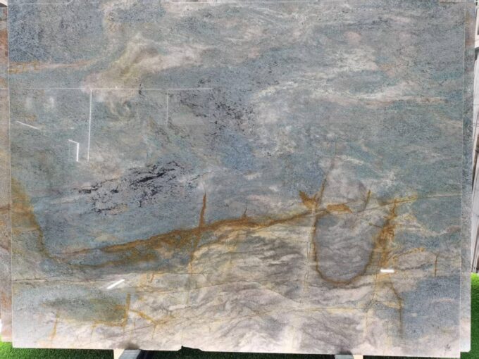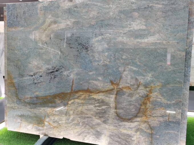 Brazilian Fusion Green quartzite slabs are used for kitchen countertops and bathroom basins
