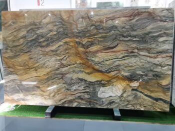 Brazilian Fusion Green quartzite slabs are used for kitchen countertops and bathroom basins